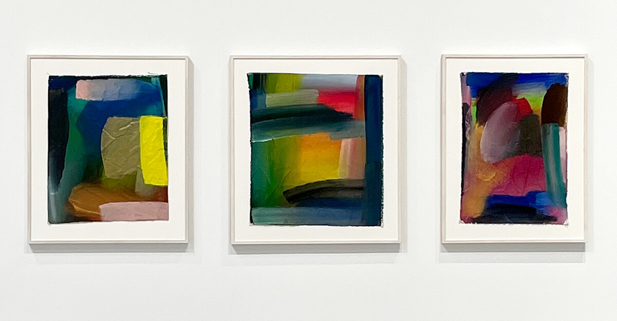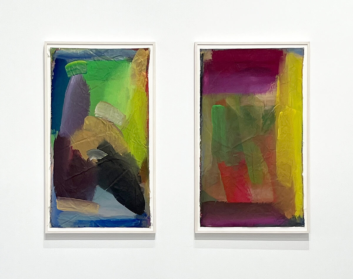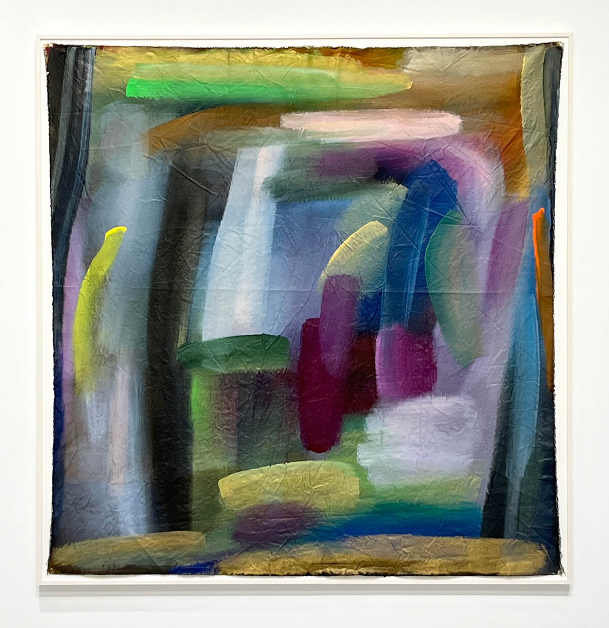 In the paintings of Okayama, “the colors appear, from a distance, unmoored, like they are floating off the canvas. A ghostly swish of orange hovers over a fuchsia wash. This effect changes the closer you get: Move in, and you start to see ridges and creases preserved by the plastic of the acrylic. Okayama prewashed but did not prime his canvas, which led to these wrinkles and made his otherwise ephemeral artworks feel so much more tactile.”
